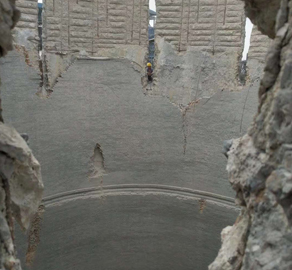 (3)施工人員立在腳手架上,安全帶掛在鋼管上后,用風鎬、手錘由外向內將筒體逐塊拆除,使碴塊全由筒體內部落下;