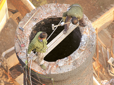 11、35米高煙囪拆除分成兩段實施,25米以上人工拆除,人工拆除前將通通風口作為出渣口,采用小鏟車出渣,施工人員站在腳手架上,安全帶掛在鋼管上,用手錘由外向內將筒體拆除,使渣由筒內掉落。